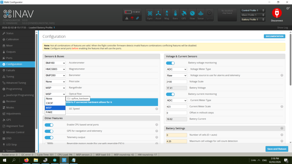 Set Optical flow and Rangefinder to MSP