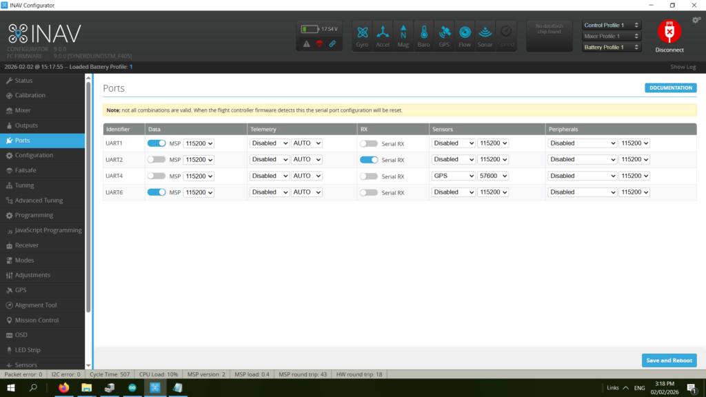 here we place is on UART 6 as this is one of the ports available at MSP 115200 baud